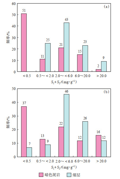 作为岩石热解的重要参数之一,生烃潜量(S1+S2)亦可对有机质丰度进行评价,其由2个部分组成,一部分为已经生成的烃,即可溶烃(S1),另一部分为热解烃(S2)。分析测试结果(图 3)显示,甘泉地区本溪组暗色泥岩的S1+S2为0.01~23.50 mg/g,其中达到中等以上级别的烃源岩占比为38%;煤层的S1+S2为0.7~31.5 mg/g,达到中等以上级别的烃源岩占比较高,可达75%。山西组暗色泥岩的S1+S2为0.23~29.5 mg/g,其中达到中等以上级别的烃源岩占比为50%;煤层的S1+S2为0.7~39.5 mg/g,其中达到中等以上级别的烃源岩占比达84%。综上所述,研究区山西组有机质丰度整体较高,是相对优质的烃源岩,且优于本溪组烃源岩。