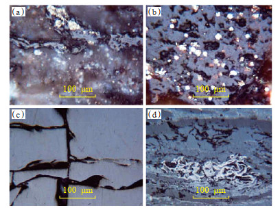 下载原图 图 5 甘泉地区上古生界干酪根显微组分镜下照片 (a)泥岩镜质体,Q301井,2 231.5 m,山西组;(b)泥岩镜质体,Q389井,2 289.9 m,山西组;(c)泥岩丝质体,Q565井,2 753.9 m,本溪组;(d)煤丝质体,Q426井,2 751.1 m,本溪组。 Fig. 5 Microscopic component of kerogen of Upper Paleozoic in Ganquan area |