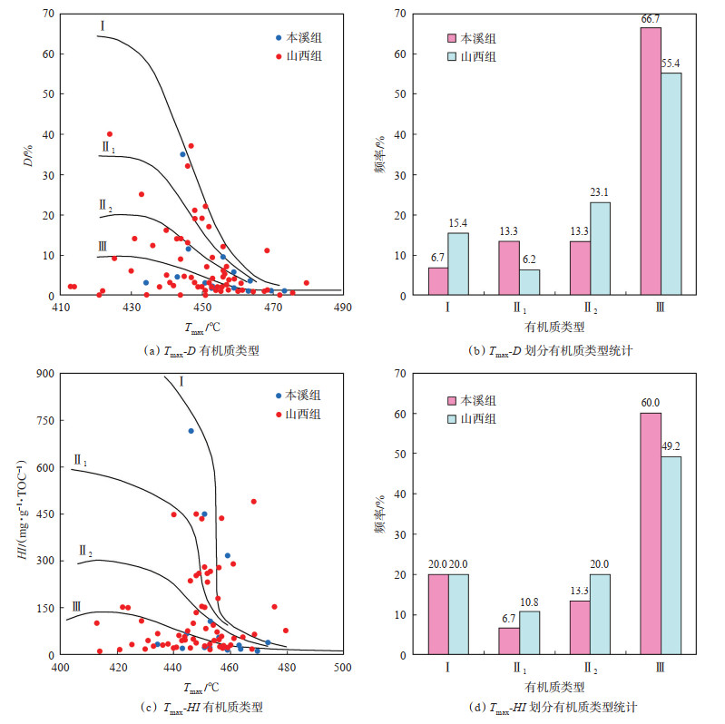 甘泉地区上古生界烃源岩岩石热解实验(本溪组选用8口井16个样品,山西组选用19口井68个样品)结果表明,本溪组热解最高峰温(Tmax)为434.4~473.4 ℃,平均为454.7 ℃,降解潜率(D)为0.9%~34.9%,平均为5.6%,氢指数(HI)为9.0~ 715.5 mg(/ g·TOC),平均值为126.5 mg(/ g·TOC);山西组热解最高峰温为413.0~479.6 ℃,平均为447.0 ℃,降解潜率为0.5%~40.0%,平均为7.4%,氢指数为8.5~588.0 mg(/ g·TOC),平均为124.7 mg/(g·TOC)。总体而言,本溪组热解最高峰温整体高于山西组,而降解潜率及氢指数整体低于山西组。选用热解最高峰温(Tmax)与降解潜率(D)、热解最高峰温(Tmax)与氢指数(HI)图版(图 6a—6d),对有机质类型进行判定。Tmax-D有机质类型划分图版显示,样品点在各类型有机质区间均有分布,但就本溪组而言,绝大多数(占比约为66.7%)有机质类型为腐殖型Ⅲ类,山西组的有机质类型则以腐殖型Ⅲ类、腐泥-腐殖型Ⅱ2为主。由Tmax-HI有机质类型划分图版可以观察到与Tmax-D有机质类型划分图版相似的情况,即本溪组绝大多数(占比约为60.0%)有机质类型为腐殖型Ⅲ类,而山西组的有机质类型则多为腐殖型Ⅲ类,其次为腐泥-腐殖型Ⅱ2,样品占比分别为50.8% 与20.0%。