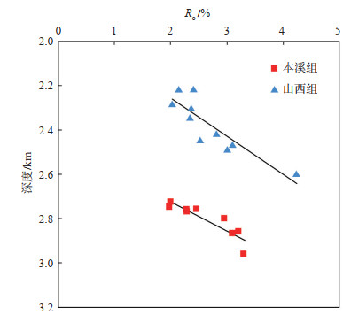 下载原图 图 7 甘泉地区上古生界本溪组与山西组镜质体深度与反射率的关系 Fig. 7 Relationship between depth and vitrinite reflectance of Benxi Formation and Shanxi Formation of Upper Paleozoic in Ganquan area |