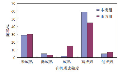 下载原图 图 8 甘泉地区上古生界本溪组与山西组有机质成熟度统计 Fig. 8 Histogram of organic matter maturity of Benxi Formation and Shanxi Formation of Upper Paleozoic in Ganquan area |