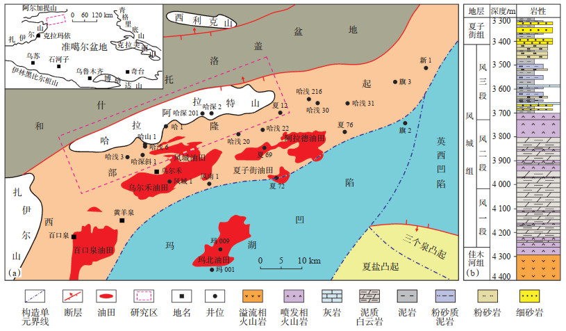 1 地质概况哈山地区位于准噶尔盆地西北缘,构造上隶属于哈-德(哈山—德伦山)构造带的西端,南部紧邻玛湖生烃凹陷,北以达尔布特断裂为界与和什托洛盖盆地相接,西部为扎伊尔山,整体呈北东—南西向展布,有效勘探面积约1 000 km2[5, 12](图 1a)。早二叠世晚期(风城组沉积期),哈山地区经历了裂陷由鼎盛期至衰退期的整个过程,火山活动减弱,水体扩大加深,受水体蒸发和火山岩物质蚀变影响,形成咸化-还原-碱湖沉积水体环境,形成了碎屑岩-火山岩-云质岩混积,且呈此消彼长的特征[12]。风城组沉积早期为大范围湖侵期,广泛发育滨浅湖—半深湖沉积,且火山活动相对强烈,砂体不发育,云质岩在研究区内广泛发育[12-14];风城组沉积晚期,火山活动减弱,随着物源供应量的加大,扇体规模迅速扩大,碎屑岩广泛发育,云质岩展布范围明显减小[12]。总体上,风城组自下而上可分为风一段—风三段(图 1b):风一段主要发育湖泊相白云质粉砂岩、泥质白云岩、白云质泥岩、凝灰岩等细粒混积岩,底部常发育爆发相火山岩;风二段主要发育湖泊相白云岩、泥质白云岩等混积岩,夹薄层爆发相火山岩;风三段主要沉积碎屑岩,岩性较细,主要为灰白色、棕褐色泥质粉砂岩、泥岩等,夹薄层泥质白云岩,属于扇三角洲相沉积[12, 14]。