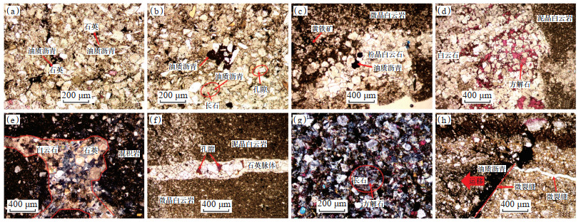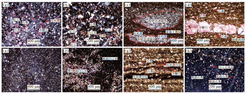 碳酸盐岩页岩油储层岩性主要为泥晶白云岩和泥质白云岩。其中,泥晶白云岩中的白云石颗粒较小,夹少量石英碎屑颗粒,有机质碎片散乱分布(图 2e),在一定条件下,泥晶白云岩也可以发生重结晶,形成微晶—细晶白云岩,但有机质相对匮乏(图 2f);泥质白云岩中相对富集有机质,通常以泥质条带形式分布,常可见有机质纹层呈韵律分布,且纹层中方解石较为发育,纹层之间可见棱角状碎屑颗粒(以石英和长石为主)(图 2g),这种韵律特征可能与古气候韵律变化有关。此外,白云岩可在遭受强烈的硅化作用后形成硅质岩(图 2h)。