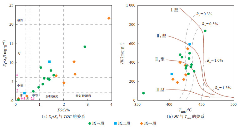 哈山地区风城组页岩中的有机质通常呈碎片状或条带状分散赋存,有机质丰度较高,TOC值为0.12%~3.88%,平均为1.44%,约70% 样品的TOC值大于1.00%;生烃潜量(S1+S2)为0.20~21.60 mg/g,平均为6.41 mg/g,约45% 样品的S1+S2值大于6.00 mg/g。根据陆相烃源岩评价标准[19],哈山地区风城组页岩整体属于好—最好烃源岩(图 3a)。