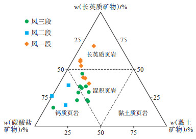 目前关于页岩岩相的分类与命名,基本上是采用XRD矿物组分的三端元组分法,三端元分别为碳酸盐矿物(方解石和白云石)、长英质矿物(石英和长石)和黏土矿物[18, 20]。由于哈山地区风城组页岩中含有数量不等的方沸石,且方沸石属于钠铝硅酸盐,是常见的似长石矿物,因此将方沸石划入长英质矿物端元。根据三端元组分法,将研究区风城组页岩划分为3类岩相,即长英质页岩岩相、钙质页岩岩相和混积页岩岩相。其中,风一段页岩主要为长英质页岩和混积岩,而风二段页岩主要为钙质页岩,风三段页岩以混积岩和钙质页岩为主(图 4)。
