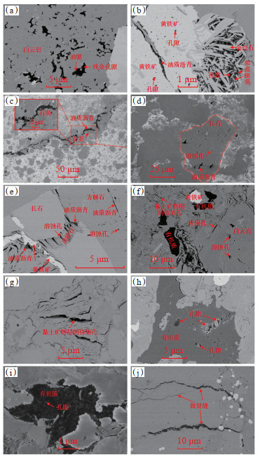 粒内溶蚀孔主要由不稳定矿物发生溶蚀作用所形成,孔隙形状多样,大小不一,孔径分布范围广。研究区风城组页岩中的长石矿物和碳酸盐矿物为最主要的不稳定矿物,粒内溶蚀孔主要发育在这2类矿物中。在长英质页岩中,长石类矿物经常遭受溶蚀作用,同时很容易被方解石所胶结充填(图 5g),且长石溶蚀多沿解理缝进行,其粒内溶蚀孔呈长条状,其中较大孔隙被油质沥青所充填(图 6c);部分长石颗粒仍然可见高岭石化,长石遭受溶蚀后形成大量的狭缝状孔隙和具有书页状的高岭石,部分孔隙被油质沥青所充填(图 6d)。风城组页岩中碳酸盐矿物(如方解石和白云石)更容易遭受溶蚀作用,有机质生烃演化形成的有机酸可以对方解石和白云石颗粒进行不同程度的溶蚀,形成粒径大小不一的溶蚀孔,部分孔隙被油质沥青所充填(图 6e)。