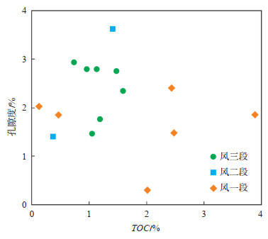 3.2.2 有机质孔哈山地区风城组页岩中有机质较为发育,页岩中可见大量的有机质碎片,形状各异,多呈块状或条带状分布在页岩中,扫描电镜下这些有机质碎片中的孔隙发育情况较差,可能与有机质成熟度较低有关。部分有机质碎片中仍可见数量不等的孔隙发育,孔隙呈近圆状、椭圆状或不规则状等,有机质孔径从纳米级到微米级(图 6h,6i)。有机质孔可根据其形貌和成因进一步划分为原生有机质孔和次生有机质孔。原生有机质孔属于有机质内部的组织结构孔隙,常呈规律分布,粒径不均一,以椭圆状居多,偶见孔隙被其他黏土矿物所充填(图 6h);次生有机质孔与我国南方海相页岩中的有机质孔隙类似[21],多呈不规则状,粒径多为纳米级,在整块有机质碎片中均有分布(图 6i)。由于哈山地区风城组页岩有机质成熟度较低,且有机质初次裂解形成有机质孔可能发生在Ro> 0.5% 的条件下[22-23],但干酪根在早期生油过程中也可能形成有机质孔。总体而言,哈山地区风城组页岩中发育有一定数量的有机质孔,但其TOC值与孔隙度不具有相关性(图 7),因此,其总体上对储集性能的贡献较小。