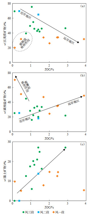 研究区风城组页岩作为“源储一体”的储集岩,不仅需要具有生烃能力,还需具备储集能力。沉积相对风城组页岩油富集的控制作用主要体现在以下2个方面:①沉积相控制了页岩中有机质的富集程度;②沉积相控制了页岩的矿物组成,从而控制了不同岩相页岩的发育范围[9]。随着向湖盆方向推进,碎屑物源供给逐渐减少,云质岩的发育程度逐渐增强,水体环境也逐渐趋于平静,有机质纹层逐渐增多,造成了远岸地区混积页岩长英质矿物逐渐减少,碳酸盐矿物逐渐增多,TOC值也逐渐升高。碳酸盐矿物的过度增加对有机质造成稀释作用,降低了页岩的TOC值(图 8a,8b)。同时,随着向湖盆方向的推进,安静水体中的黏土矿物可能与有机质发生絮凝作用,从而造成了有机质的富集。值得注意的是,在平静水体中沉积的富碳酸盐页岩也具有较高的TOC值,这也造成TOC与黏土矿物含量的关系较为复杂(图 8c)。
