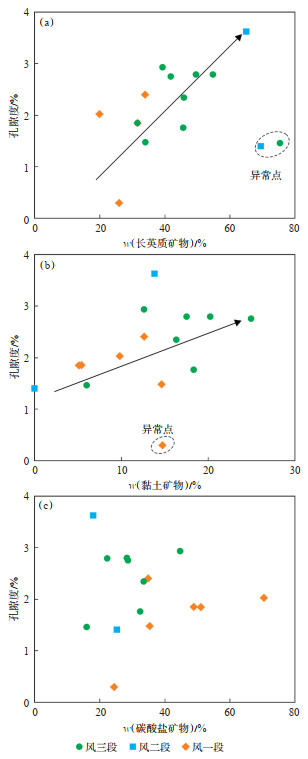 哈山地区风城组页岩孔隙度与长英质矿物、碳酸盐矿物和黏土矿物含量的相关关系显示,孔隙度随着长英质矿物和黏土矿物含量的增加而呈现出上升趋势(图 9a,9b),但并未表现出与碳酸盐矿物具有明确的相关性(图 9c)。这主要是由于:①长英质矿物的增加会形成贫有机质的泥质粉砂岩,大量刚性颗粒可以形成抗压实骨架,进而形成大量的粒间孔;②黏土矿物中发育大量的层间格架孔,对总孔隙度的贡献较大;③页岩中的碳酸盐矿物可以提供大量的粒间孔和粒内孔,也可以造成广泛的钙质胶结,降低整体孔隙度,因此孔隙度与碳酸盐矿物含量之间的关系较为复杂。