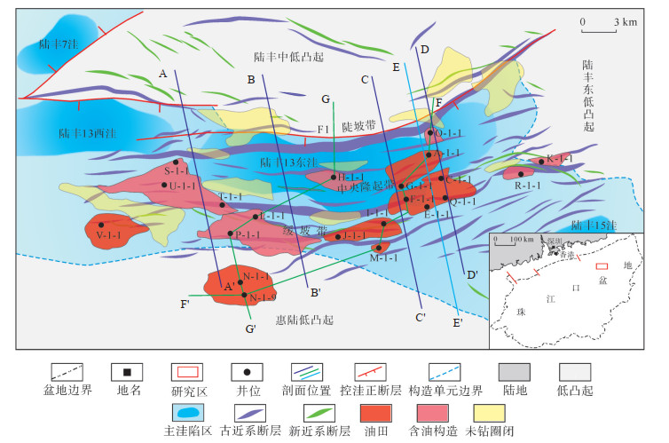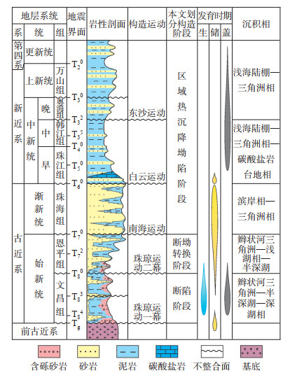 1 地质概况陆丰凹陷为珠江口盆地东北部一个以新生代沉积为主的凹陷,面积约为7 760 km2,是油气勘探的重点区域。陆丰13东洼位于陆丰凹陷南部地区,被惠陆低凸起、陆丰中低凸起、陆丰东低凸起、陆丰13西洼与陆丰15洼所围限(图 1),为已经证实的富烃洼陷。在珠江口盆地大的构造背景下,陆丰13东洼新生代经历了多期次构造活动,包括珠琼运动一幕、珠琼运动二幕、南海运动、白云运动和东沙运动等[19-20]。研究区自下而上分别沉积了古近系文昌组、恩平组、珠海组,新近系珠江组、韩江组、粤海组、万山组及第四系等地层,沉积环境也逐渐从陆相过渡为海相[21-23]。其中古近系为陆相、海陆过渡相沉积,受断层活动影响较大,烃源岩和储层较为发育;新近系则为海相沉积,具有区域性连续分布特征,受断层活动影响小[11],发育厚层的区域泥岩盖层(图 2)。