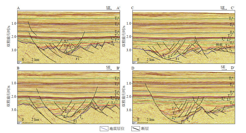 陆丰13东洼是在前古近系基底之上经由断陷作用、坳陷作用等形成,多期次的构造运动控制了陆丰13东洼的断裂活动与展布、地层的沉积与剥蚀。通过对陆丰地区地震资料的解释,识别出Tg,T84,T83,T80,T72,T70,T60,T50,T40,T32和T30等区域性地震界面(图 3),它们是各地质历史时期构造运动留下的最直接、最重要的证据。