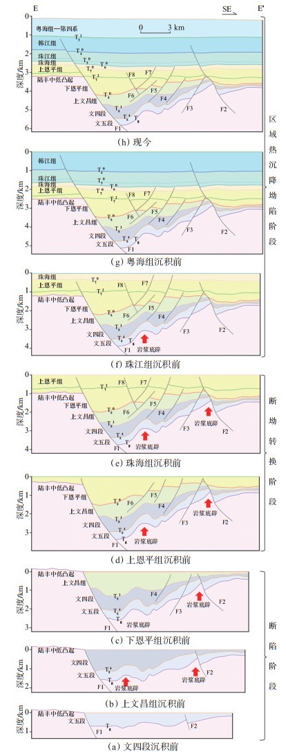 渐新世以来,软流圈流动及上涌活动减弱,在深部地幔供热减少和浅部壳幔热能散失的共同作用下,壳幔开始冷却,发生区域性热沉降,断层对沉积的控制作用消失[11],陆丰13东洼进入区域热沉降坳陷阶段。平衡剖面揭示,珠海组沉积时期陆丰13东洼构造活动大大减弱,大部分断裂停止活动,F1断裂也不再控制沉积,只有洼陷中部部分断裂继续活动(图 4f);韩江组沉积时期及之后,陆丰13东洼地区构造活动又开始相对活跃起来,在产生新断层的同时,部分早期老断层(F1,F2)也被激活(图 4g),平面上主要呈NW走向,部分为NE走向(图 1)。该时期陆丰13东洼主要沉积了珠海组—第四系海陆过渡相及海相地层,广泛分布的厚层海相泥岩是本地区优质的区域盖层。