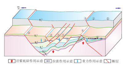 3 构造演化与圈闭形成陆丰13东洼各类型圈闭的形成与该地区的构造演化及构造活动密切相关。在断陷阶段及断坳转换阶段的早期,洼陷拉张作用强烈,并伴有岩浆底辟作用和地层掀斜作用;沉积区域主要集中在洼陷区,主要发育与断层活动关系密切的断块圈闭、断鼻圈闭、断背斜圈闭、构造-地层圈闭和构造-岩性圈闭;此阶段形成的圈闭种类和数量都最多,并且邻近烃源岩,成藏条件优越。到断坳转换阶段晚期及区域热沉降坳陷阶段,湖盆水体开始漫过周边低凸起,地层逐渐超覆或披覆在低凸起之上,此时构造-地层圈闭(超覆)、披覆背斜圈闭较为发育。同时,由于受晚期构造活化作用的影响,也发育断鼻圈闭与断背斜圈闭。此阶段的圈闭主要分布于低凸起或洼陷的远端,距离优质烃源岩相对较远,有利的油气运移路径是此类圈闭成藏的关键。
