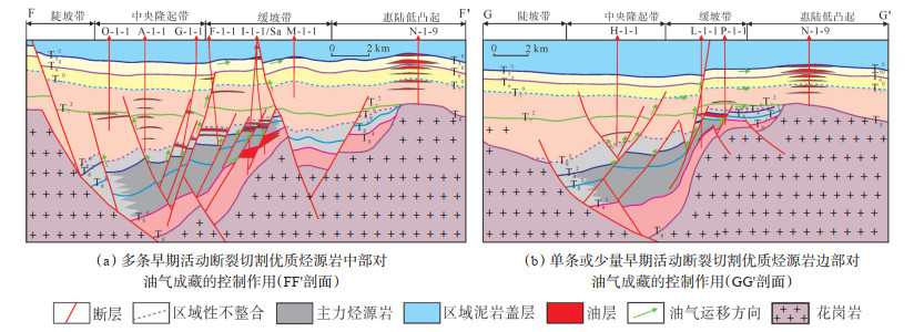 勘探实践表明,虽然经历了大致相同的构造演化过程,但是陆丰13东洼不同部位圈闭的成藏特征还是有一定的区别,主要表现为:①中央隆起带、缓坡带古近系圈闭邻近断陷期沉积的优质烃源岩,具有近源成藏的特征;多条早期活动断裂切割优质烃源岩,形成由早期活动断裂与砂体构成的运移体系,有效沟通了烃源岩与中央隆起带、缓坡带圈闭,从而能大规模连片成藏,如A-1-1,F-1-1和I-1-1等井区古近系圈闭(图 6a)。②缓坡带浅层新近系及低凸起区圈闭,由于距离优质烃源岩较远,主要通过早期断裂、长期断裂、砂体及不整合面构成的复合运移体系进行较长距离的油气运移,位于优势运移路径上的各类圈闭具有较好的成藏条件,能规模成藏,如I-1-1和M-1-1井区新近系圈闭,N-1-9井区新近系及古近系圈闭(图 6)。③中央隆起带早期活动断裂切割烃源岩的部位和方式对该区带圈闭的油气成藏有较大影响,多条早期活动断裂切割优质烃源岩中部较单条或少量早期活动断裂切割优质烃源岩边部对圈闭油气成藏更为有利。如A-1-1与G-1-1井区有多条早期活动断裂切割优质烃源岩中部,从而形成了多层段规模性油气藏,具有商业价值(图 6a);而距离不远的H-1-1井区为单条早期活动断裂切割烃源岩边部,钻探结果证实其油层单薄,储量规模小,不具备商业开发价值(图 6b)。④断陷及断坳转换阶段形成的早期活动断裂对烃源岩发育、圈闭形成、油气运移均具有较为积极的作用;而区域热沉降坳陷阶段发育的晚期活动断裂,尤其是激活早期活动断裂后形成的长期活动断裂对早期油藏具改造或破坏作用,不利于早期油藏的保存。如L-1-1和K-1-1井区发育长期断裂,油气显示虽然丰富,但含油饱和度不高,解释油层少,无规模储量,无商业开发价值(图 6b)。