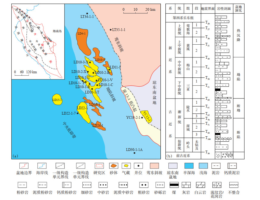 下载原图 图 1 莺歌海盆地构造单元划分(a)及研究区岩性地层综合柱状图(b)(据文献[13]修改) Fig. 1 Tectonic units of Yinggehai Basin(a)and stratigraphic column of LD10 area(b) |