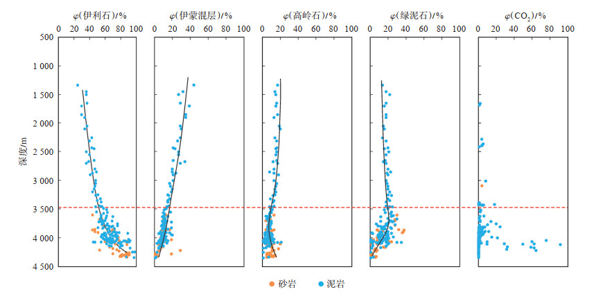 下载原图 图 10 莺歌海盆地LD10区新近系梅山组—黄流组主要黏土矿物含量及CO2含量随深度的变化 Fig. 10 Variation of main clay mineral content and CO2 content with depth of Neogene Meishan-Huangliu Formation in LD10 area, Yinggehai Basin |