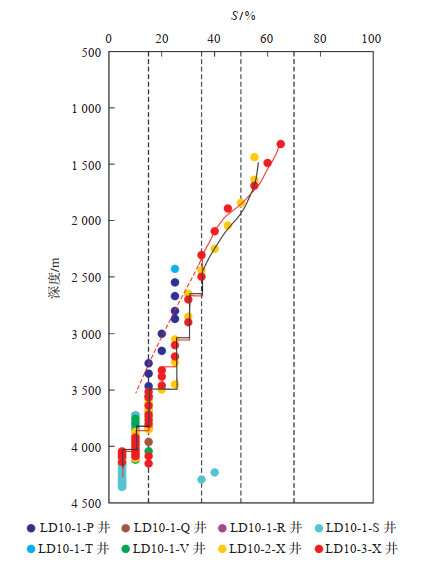 在超压地层中,蒙皂石转化不仅受温度影响,超压也是控制蒙皂石向伊利石转化的另一关键要素[28]。LD10区在2 300 m之上的地层中,黏土矿物转化和常压地层无异,伊蒙混层中蒙皂石的含量(S%)随深度连续变化,单调递减。在接近2 300 m时开始发育超压,S% 随深度的增大呈阶梯状跳跃变化(图 11)。
