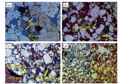 3.3 溶蚀作用溶蚀作用主要表现为长石、岩屑和碳酸盐胶结物的溶蚀。长石、岩屑可形成铸模孔(图 12a)、粒内溶孔(图 12b),碳酸盐胶结物的溶蚀则常形成粒间溶孔(图 12c)。研究区溶蚀作用具有较强的区域特征,成岩中后期底部CO2的充注造成早期方解石接触式溶蚀(图 12d)。在成岩作用早期,孔隙流体受压实作用从泥岩中排出,溶解的钙离子亦随孔隙流体进入邻近储层孔隙中。新近纪,中央凹陷内发育大规模的底辟活动,富含CO2的高温流体沿凹陷斜坡带隐伏断裂从深部向上运移[13, 30],与原始地层水相互作用形成偏酸性环境,对致密胶结层产生接触溶蚀作用(溶蚀方解石),使致密胶结层具有一定的渗流能力,常见大量溶蚀残余(图 12c)。