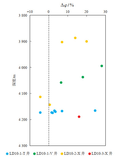 富含CO2的高温流体活动对于储层孔隙度发育具有两面性,既可以通过溶蚀作用形成次生孔隙,也可以形成碳酸盐胶结物,降低孔隙度。在LD10区,碳酸盐胶结造成的减孔作用大于溶蚀作用的增孔作用(图 13),即富含CO2的高温流体活动对储层孔隙度发育整体上表现为负作用。