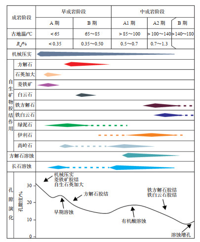 进入中成岩A期后,地层温度持续升高,Ro增大,Ro为0.5%~1.3%。以Ro=0.7% 为界,中成岩阶段可划分为A1和A2共2个亚期。其中A1期有机质为低成熟,携带有机酸和CO2的高温流体进入储层后,成岩环境逐渐变为酸性,酸性流体与岩石矿物相互作用,大量长石和早期形成的碳酸盐胶结物被溶解,形成次生溶蚀孔隙。中成岩A2期有机酸浓度开始降低,水体环境逐渐变为碱性,铁白云石及铁方解石等碳酸盐胶结物开始沉淀,伊利石大量生成,储层进一步致密化。