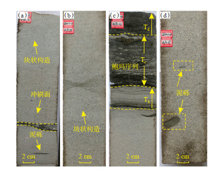 LD10-1-T井整体以灰色砂岩为主,泥岩相对不发育,块状沉积构造最为发育(图 2a,2b),可观察到典型的鲍玛序列(图 2c)及无定向排列泥砾(图 2a,2d),指示典型的重力流成因。