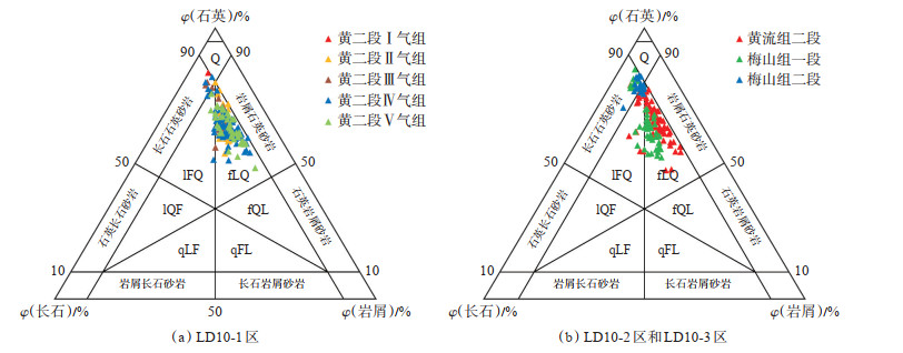 对研究区梅山组—黄流组储层共计299块岩石薄片进行岩石成分统计分析,其中LD10-1区仅有黄二段(5个气组)的岩石薄片样品。根据Garzanti[15-16]提出的砂岩分类方案,LD10区岩石类型主要为长石岩屑石英砂岩,其次为长石石英砂岩,含有少量的岩屑长石石英砂岩(图 3)。