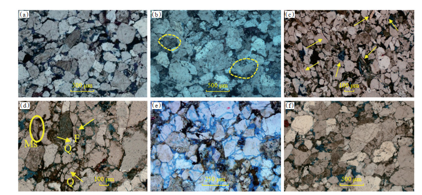 下载原图 图 4 莺歌海盆地LD10区新近系梅山组—黄流组压实作用微观照片 (a)颗粒为点—线接触,LD10-1-S井,4 109.0 m;(b)颗粒间呈凹凸接触(黄色圈),LD10-2-X井,4 137.9 m;(c)压实作用造成云母呈压扁状(黄色箭头),LD10-1-T井,4 090.0 m;(d)云母弯曲变形,颗粒破裂,发育粒内缝,LD10-1-T井,4 066.3 m;(e)脆性颗粒碎裂,发育粒内缝,LD10-1-T井,4 249.0 m;(f)颗粒定向排列,LD10-1-T井,4 080.0 m。 Fig. 4 Microscopic photos shows the compaction characteristics of Neogene Meishan-Huangliu Formation in LD10 area, Yinggehai Basin |