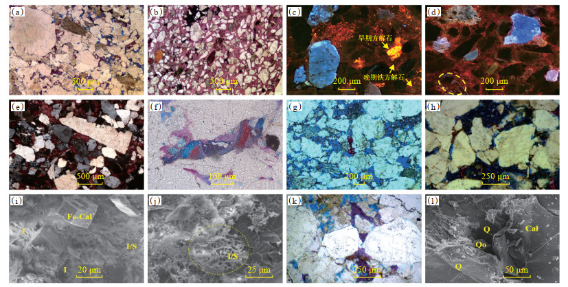 方解石多以充填粒间孔隙、交代碎屑颗粒边缘的形式产出,多呈基底式胶结(图 5a,5b),铁方解石分布较广,含量相对较高,主要呈基底式胶结(图 5c—5e),形成于成岩中晚期。铁白云石主要呈粉、细晶状零星充填于孔隙中,产出较分散(图 5f—5h),且总体含量低(体积分数普遍低于5%),对储层物性影响较小,形成于成岩中晚期,且与深部热流体有关。当携带有机酸和CO2的高温流体进入储层后,使得部分长石及早期碳酸盐矿物溶解,溶液中Fe2+含量升高,导致铁白云石的沉淀。