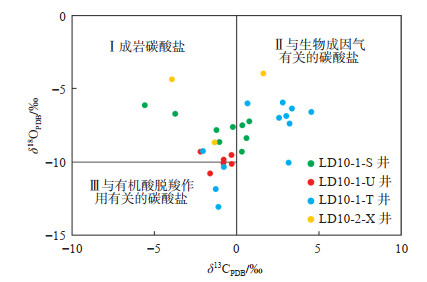 下载原图 图 6 莺歌海盆地LD10区新近系梅山组—黄流组碳酸盐胶结物中碳、氧同位素的交会图 Fig. 6 Crossplot of carbon and oxygen isotopes of carbonate cement of Neogene Meishan-Huangliu Formation in LD10 area, Yinggehai Basin |
