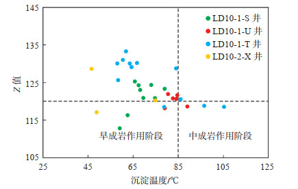 为进一步明确形成碳酸盐胶结物的流体来源及自生碳酸盐胶结物的形成时期,在碳、氧同位素测试结果的基础上,利用Keith等[21]提出的经验公式(式1)计算出无量纲Z值,用以粗略判断孔隙流体性质。计算得知LD10区的Z值为112.82~133.32,平均为123.12。根据Keith等[21],Z值大于120说明形成于偏海水环境(图 7)。