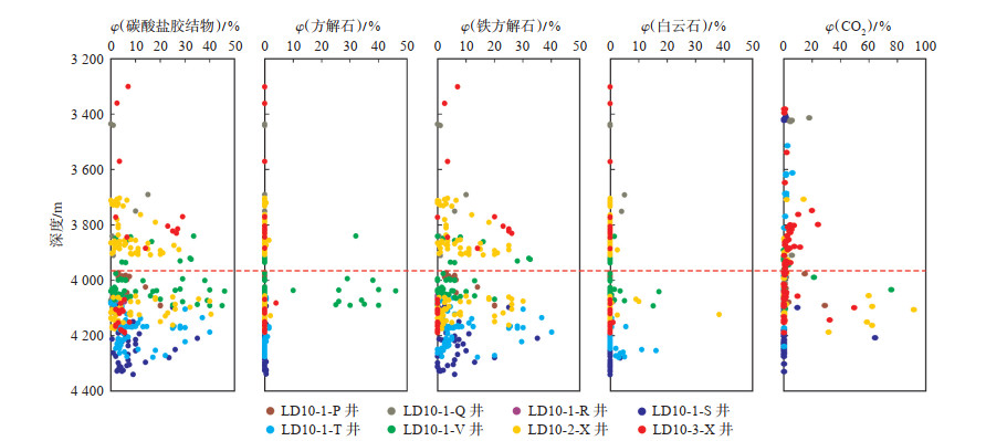 下载原图 图 8 莺歌海盆地LD10区新近系梅山组—黄流组碳酸盐胶结物含量及CO2含量随深度的变化 Fig. 8 Variation of carbonate cement content and CO2 content with depth of Neogene Meishan-Huangliu Formation in LD10 area, Yinggehai Basin |