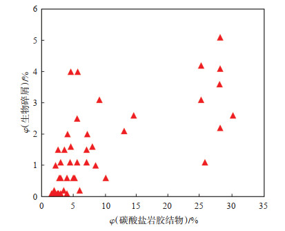 纵向上,碳酸盐胶结物具有明显的分区分带性(图 8),3 700~3 900 m以及4 000~4 200 m为2个碳酸盐胶结物强发育深度带。对薄片中胶结物含量与生物碎屑含量进行统计可知,二者具有较好的正相关关系(图 9),说明碳酸盐岩胶结物的形成与生物碎屑的分布有关。