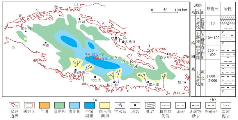 1 地质概况柴达木盆地为典型的内陆封闭性巨大山间断陷盆地,沉积初期地势东高西低,后期受板块俯冲运动,中西部隆起剥蚀,盆地东部形成坳陷,呈现出稳定持续的相对沉降,形成了第四系泥岩沉积[21],为正旋回湖泊相沉积。弱水动力条件使沉积表现为薄层砂、泥岩频繁交互[22],厚度约为3 km。涩北地区位于柴达木盆地三湖第四系坳陷内,为完整的沉积短轴背斜构造,具有顶部缓、翼部陡的特点。该区地层自下而上为下更新统、中更新统、上更新统和全更新统,其中下更新统以棕色、灰绿色、深灰色泥岩为主,泥质粉砂岩、粉砂岩次之,多层炭质泥岩,砂泥岩呈薄互层分布;中更新统中下部主要为灰色、浅灰色泥岩,夹少量粉砂层和未炭化的生物碎屑;全更新统—中更新统上部主要为较纯的盐岩沉积[23](图 1)。该段储层表现为高孔隙、中—低渗透率特征,孔隙结构复杂,孔径为纳米级—微米级。