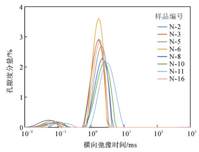 下载原图 图 2 柴达木盆地涩北地区第四系泥岩型生物气储层岩样饱和水状态核磁共振T2谱 Fig. 2 NMR T2 spectrum of water-saturated rock samples of Quaternary mudstone biogas reservoirs in Sebei area, Qaidam Basin |