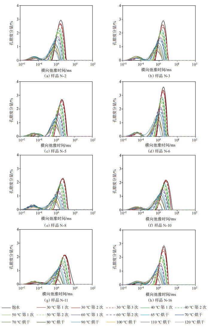 在渐变烘干温度核磁共振实验中,随着温度的升高,T2谱幅度逐渐减小且左移趋势明显(图 3),所有样品的横向弛豫时间都逐渐变小,在最终烘干温度状态下,所有样品核磁共振谱峰值所对应的横向弛豫时间约为0.8 ms。