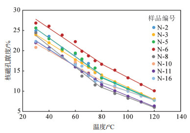 对样品烘干温度及其对应的核磁孔隙度进行分析(图 4)可知:①随着温度的上升,核磁孔隙度逐渐减小,且减小幅度具有明显的分段特征,第1段温度为30~80 ℃时,核磁孔隙度减小幅度较大,第2段温度为80~120 ℃时,核磁孔隙度减小幅度变缓。②根据烘干过程中孔隙度变化幅度及泥岩中流体赋存状态,可以认为在第1段烘干状态中孔隙流体运移速度较快,即可动水与毛管束缚水蒸发;拟合曲线斜率的大小反映了不同阶段流体蒸发的速度,该段斜率较大,表示孔隙中可动水与毛管束缚水的蒸发速度较快。第2段高温烘干过程中孔隙流体几乎不发生运移,较小孔隙中的黏土束缚水蒸发散失;该段斜率相对较小,表明黏土束缚水的蒸发速度较慢。③2个阶段的交点所对应的温度即为黏土束缚水蒸发的温度阈值,根据线性拟合得到样品N-2,N-3,N-5,N-6,N-8,N-10,N-11和N-16的实验温度阈值分别为85 ℃,80 ℃,85 ℃,80 ℃,75 ℃,85 ℃,85 ℃和80 ℃(表 2)。温度阈值处为岩样中毛管束缚水完全蒸发排出,黏土束缚水开始排出的转折点,在此状态下,孔隙中不含可动水与毛管束缚水,流体均以黏土束缚水状态赋存于岩样孔隙中。