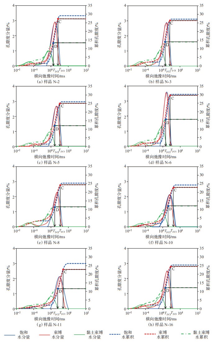下载原图 图 6 柴达木盆地涩北地区第四系泥岩型生物气储层岩样不同类型流体的核磁孔隙度细解 Fig. 6 NMR Porosity analysis of different types of fluids in rock samples of Quaternary mudstone biogas reservoirs in Sebei area, Qaidam Basin |