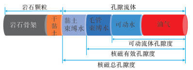 通过核磁共振测量的总孔隙度包含连通孔隙与孤立孔隙,有效孔隙是去除孤立孔隙后,对油气运移储集有贡献的那部分孔隙,因此有效孔隙度仅为连通孔隙的孔隙度。柴达木盆地涩北地区第四系泥岩型生物气储层中黏土束缚水占据的空间无气体填充,属于无效孔隙,毛管束缚水孔隙和可动水孔隙为有效孔隙。核磁总孔隙度包括可动水孔隙度、黏土束缚水孔隙度和毛管束缚水孔隙度,核磁有效孔隙度包括毛管束缚水孔隙度和可动水孔隙度(图 6)。