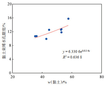 黏土含量和黏土束缚水孔隙度呈正相关关系(图 7),黏土含量越高,黏土束缚水孔隙度越大。分析认为黏土矿物与水接触后,表面颗粒吸水形成水膜,矿物颗粒产生膨胀,造成地层水堆积堵塞[28-30],使得微小孔隙被束缚水侵占,黏土束缚水孔隙度越大,有效孔隙度随之减小。