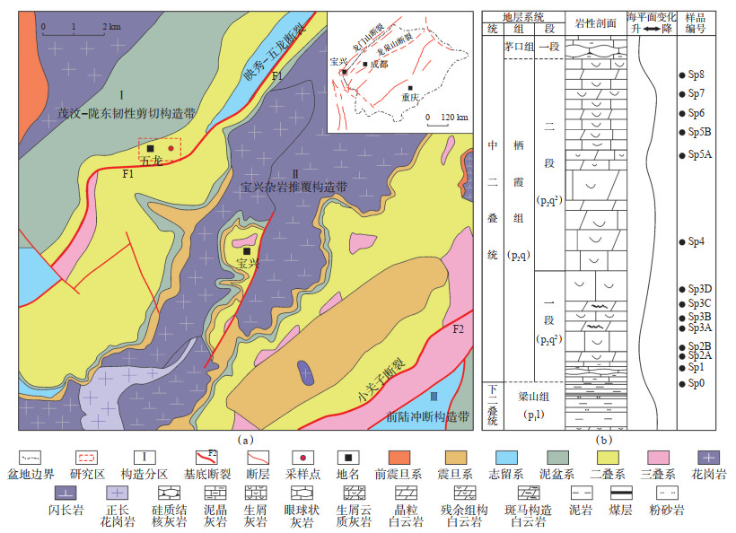 1 地质概况研究区位于川西南雅安市宝兴县,构造上位于映秀—五龙断裂与小关子断裂之间,受茂汶—陇东韧性剪切构造带及宝兴杂岩推覆构造带影响(图 1a)。研究区历经加里东运动后,沉积下二叠统梁山组(P1l)碎屑岩及中二叠统栖霞组(P2q)、茅口组碳酸盐岩。海西早期东吴运动导致宝兴地区地壳隆起、张裂,产生大量断层及裂缝,同时沿基底断裂大规模喷出岩浆岩,形成规模庞大的峨眉山大火成岩省。后期历经印支、喜山等多期构造运动叠加,发育北东—南西向大断裂及伴生北西—南东向张扭性断层。栖霞组地层厚126 m,为海进—海退旋回控制下的浅水碳酸盐沉积物,自下而上可划分为栖一段和栖二段;主要由浅灰—深灰色薄—中层泥晶生物/生屑灰岩、厚层块状亮晶生屑灰岩及晶粒白云岩组成,含薄层深灰色生屑钙质泥岩夹层,自下而上泥质含量逐渐减小,局部见眼球/似眼球状生屑泥晶灰岩及含陆源石英碎屑的生屑泥晶灰岩,偶见燧石条带/结核;生物化石含量丰富,以䗴类、腕足、棘皮等为主。研究区碳酸盐岩储层主要位于栖一段中部及栖二段顶部[22](图 1b)。