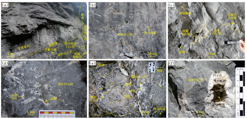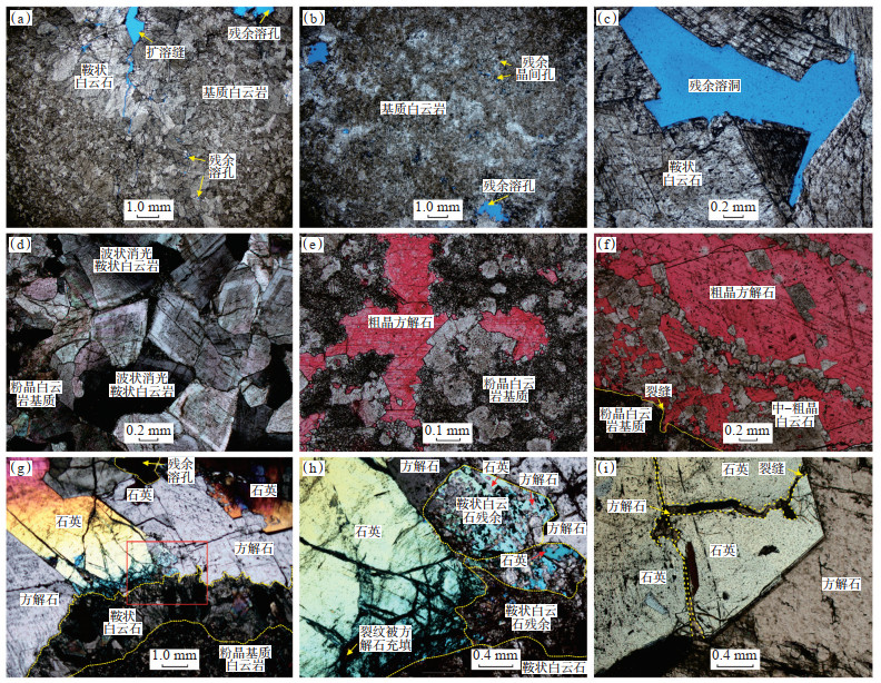 栖一段中部厚层块状晶粒白云岩中,可见断面擦痕及白云石、方解石半充填的溶蚀孔洞(图 2c)。构造角砾白云岩及角砾基质中含小型斑马构造,角砾间胶结物与斑马纹亮带中均发育残余溶蚀孔洞。发育斑马构造的晶粒白云岩与见残余生物组构的晶粒白云岩组合,多形成蜂窝状溶蚀孔洞(图 2c,2d)。白云岩中微裂缝呈网状发育,多垂直层面分布,粗晶鞍状白云石呈弥散状沿裂缝及层面分布,半充填—近全充填(图 2e),可见部分溶洞被鞍状白云石及晶簇状石英半充填(图 2f)。