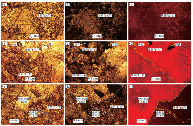 阴极发光分析表明,基质粉—细白云岩多见残余生物/生屑组构,被交代后多见颗粒边缘的溶蚀现象或破碎现象,基质白云岩发暗红色光,基质白云岩晶粒(颗粒)边缘多发亮红色光(图 4a—4c),总体指示基质白云岩形成期Fe2+和Mn2+的含量均较低,属早期成因。细—中晶具斑马构造的白云岩基质(暗带)发暗红—红色光,半充填顺层亮带的中—粗晶鞍状白云石发暗红—红色光,生长环边发亮红色光(图 4d—4f),反映基质是受亮带白云石形成过程中的同源流体改造所致,属浅—中埋藏期成因。构造角砾白云岩基质发光暗淡,角砾间缝洞中充填的粗晶鞍状白云石发红色光,指示基质白云岩为早期交代成因,粗晶鞍状白云石为浅埋藏期成因,与斑马构造白云岩的亮带具相似成因;晚期裂缝贯穿基质白云岩,裂缝被白云石充填,晚期裂缝中充填的白云石阴极发光暗淡,指示其形成于深埋藏期(图 4g—4i)。