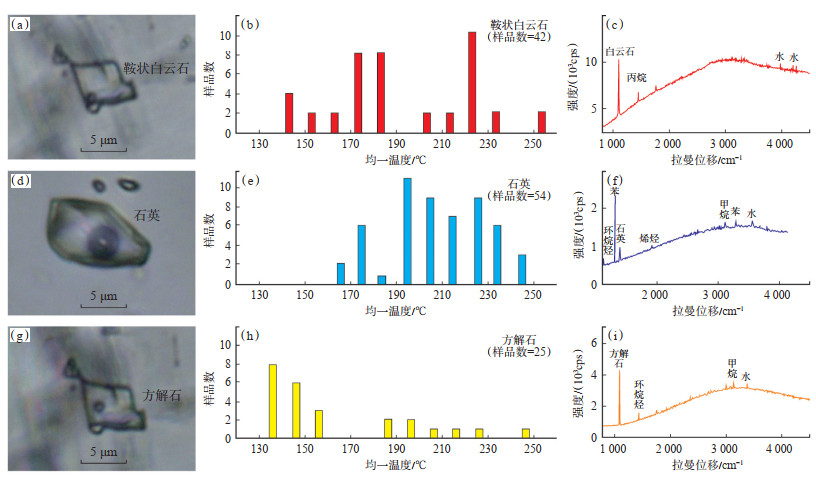 包裹体测温分析结果表明,粗晶鞍状白云石包裹体均一温度为144.7~255.6 ℃,平均为195.3 ℃;石英包裹体均一温度为162.3~243.8 ℃,平均为208.3 ℃;方解石包裹体均一温度为135.6~164.4 ℃,平均为164.4 ℃。从流体包裹体激光拉曼位移分析结果来看,鞍状白云石及生长环边捕获包裹体多为盐水包裹体,内部含丙烷;石英包裹体内以苯、环烷烃中环—环六烃为主,含少量乙烯、碳酸氢根及二氧化硫;方解石包裹体以水、二氧化碳和甲烷为主,含正构烷烃(图 5)。