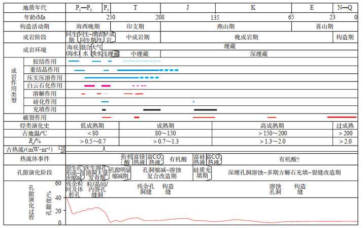 下载原图 图 6 川西南中二叠统碳酸盐岩储层构造-成岩-成藏事件及孔隙演化配置综合图 Fig. 6 Comprehensive configuration of tectonic, diagenesis, hydrocarbon accumulation and porosity evolution of Middle Permian carbonate reservoirs in southwestern Sichuan Basin |