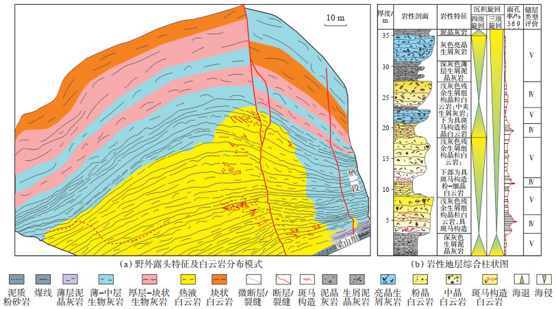 从流体性质及路径来看,川西南宝兴地区栖霞组一段热液白云岩储层的定型可能与基底断裂相关的微断裂分支密切相关。研究区宝兴背斜西侧五龙冲断层沟通基底,其形成演化曾遭受早期张性断裂向晚期逆推覆的转换。印支构造运动期,高角度构造裂缝控制下的热卤水因断裂末梢多以汇聚为主(难以有效运移排出),导致对早期石灰岩或白云岩地层进行“靠断”及“顺层”改造,进而过度白云石化。该类白云岩储层属封闭体系下形成的储层,流体总体对其以充填效应为主。燕山运动期,强烈挤压推覆构造活动迫使富硅、富二氧化碳流体沿断层自西向东运移,导致石英及方解石的多期充填,这亦是储层相对致密的主要原因。从流体作用改造规模来看,区内热液白云岩储层横向分布70~100 m,垂向厚度为5~30 m。储层多呈“圣诞树”形态,横向上与石灰岩呈指状交叉接触(图 7a)。栖一段热液改造后的斑马构造发育的白云岩储层面孔率为1%~8%,实测平均孔隙度4.30%、平均渗透率为0.633 mD,总体为Ⅳ类储层(图 7b)。石灰岩及其他白云岩储层总体属Ⅴ类储层或非储层。此外,虽然下伏梁山组碎屑岩、栖一段薄—中层含生屑泥晶灰岩分别可作为多期热流体的运移层及封隔层,但区内热液白云岩发育规模与全球典型热液白云岩相比仍有较大差异[31]。究其原因,可能主要受断裂或微断裂的发育情况(性质、规模及产状)及相对较高孔-高渗性的原岩发育的差异性控制,导致热流体对储层的顺层建设性改造作用不足且晚期流体对其强充填所致。