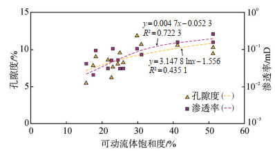 可动流体核磁共振-离心分析可以给出岩石孔隙中可动流体的比例,是直观表征储层基质储集能力及潜力的重要分析手段。对合水地区长7段砂岩型页岩油储层14块代表性样品的可动流体核磁共振测试结果(表 2)显示,该区可动流体饱和度波动范围较大且相对较低,为15.60%~51.52%,平均为28.52%。储层中可动流体主要分布在大孔喉中,部分存在小孔喉内,其中半径大于1.00 μm的喉道控制的可动流体饱和度平均为13.05%,半径为0.10~1.00 μm的喉道控制的可动流体饱和度平均为12.93%,而半径为0.05~0.10 μm的喉道控制的可动流体饱和度平均仅为2.54%。可动流体饱和度与孔隙度、渗透率之间均呈现出一定的正相关性,但与渗透率的正相关性更好,充分说明储层渗透性对可动流体饱和度的控制作用更为显著(图 6)。根据邹才能等[34-35]对非常规储层孔径的分类标准,研究区可动流体主要由纳米级喉道和亚微米级喉道所控制,且纳米级喉道和亚微米级喉道所控制的可动流体体积随着渗透率的增大而增加,开发潜力也随之增大。
