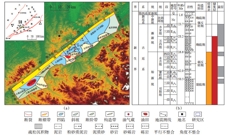 1 地质概况伊通盆地呈北东向展布于长春市和吉林市之间,面积约2 500 km2,夹持在2个大断裂(第二松花江断裂和东辽河断裂)之间[22]。盆地可划分为岔路河断陷、鹿乡断陷和莫里青断陷3个一级构造单元[23],又可进一步划分为西北缘断褶带、新安堡凹陷、万昌构造带等14个二级构造单元(图 1a)。盆地内主要发育古近系地层,新生界自下而上可划分为始新统双阳组、奢岭组、永吉组,渐新统万昌组、齐家组和中新统岔路河组及第四系(图 2b)。其中,双二段和奢一段是主要油气勘探目的层,在鹿乡断陷和莫里青断陷进行油气勘探获得高产油气[24]。岔路河断陷勘探程度中等,但多口井油气显示良好,近年来岔路河断陷波太凹陷双二段新完钻探井试油获得工业油气流,有较好的勘探潜力[25]。本次研究拟针对伊通盆地西北缘岔路河断陷古近系(奢岭组和双阳组)油气藏控藏断层封闭性进行定量评价。