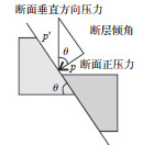 式中:p为断层面所受正压力,MPa;p' 为断面所受竖直方向的压力,MPa;H为断面埋藏深度,m;ρr为上覆地层平均密度,g/cm3;ρw为地层水密度,取1.03 g/cm3;g取值0.009 876 N/g;θ为断层倾角,(°)。断面正压力法的变量关系如图 2所示。