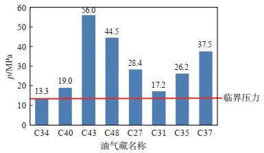 岔路河断陷古近系8个油气藏的断面正压力为13.3~56.0 MPa(图 4),断面正压力值13.3 MPa对应C34油气藏,说明在该断面正压力控制下,油气藏即可保存。由此将13.3 MPa定义为岔路河断陷垂向封闭临界压力(pc = 13.3 MPa),并可以根据pc来判断岔路河断陷中深层断层垂向封闭性。如断面正压力大于13.3 MPa,则控藏断层可有效封堵油气;如断面压力小于13.3 MPa,则控藏断层可有效运移油气。