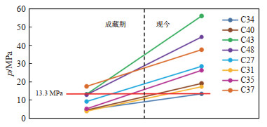3 油气藏古今封闭性对比油气藏只在现今封闭或只在成藏期开启是无法储存油气的,需要在成藏期开启且现今封闭才可能存在油气,因此对已发现的油气藏在成藏期的启闭情况进行探究是十分必要的。研究油气藏在成藏期的启闭情况首先要利用平衡剖面恢复成藏期古构造图,从而得到油气藏在成藏期的深度。研究区成藏期上覆地层平均密度由对应断层附近井密度测井资料拟合的密度-深度曲线得到;成藏期地层水密度全区均取1.03 g/cm3。经计算,岔路河断陷西北缘8个油气藏成藏期的断面正压力为3.8~17.4 MPa(表 3)。大部分油气藏成藏期的断面正压力值均小于垂向封闭临界值(除C37油气藏),断层均为开启状态,是有效的油气输导通道;现今断面正压力值大于垂向封闭临界值,断层为封闭状态,可有效封堵油气。将岔路河断陷西北缘油气藏的古今封闭性进行对比,可明确该区主要油气藏控藏断层在成藏期垂向开启,现今垂向封闭(图 6)。